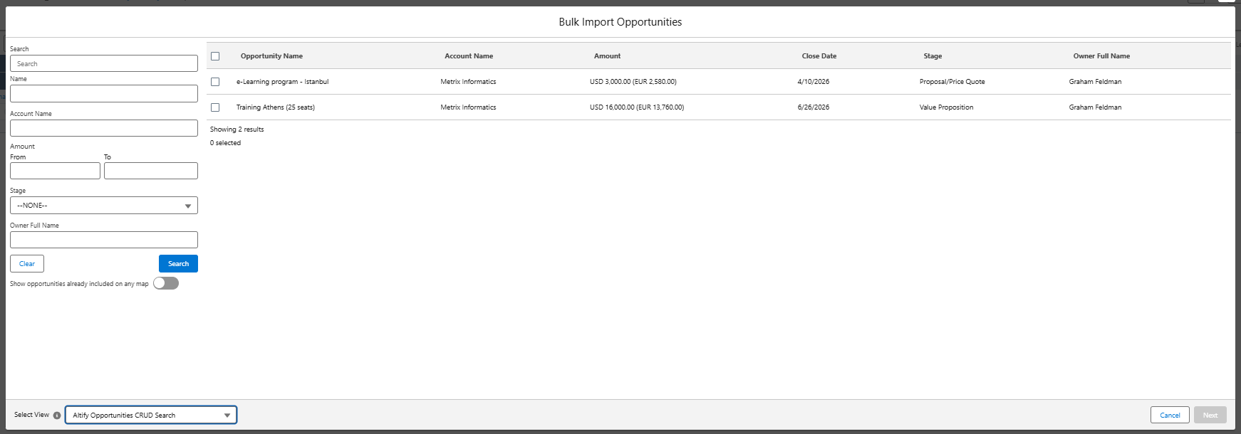 3. The Bulk Import Opportunities dialog displays opportunities for the relevant account (or accounts in the case of an account group). If you are importing through the roll up row, opportunities for all accounts within the roll up are displayed.