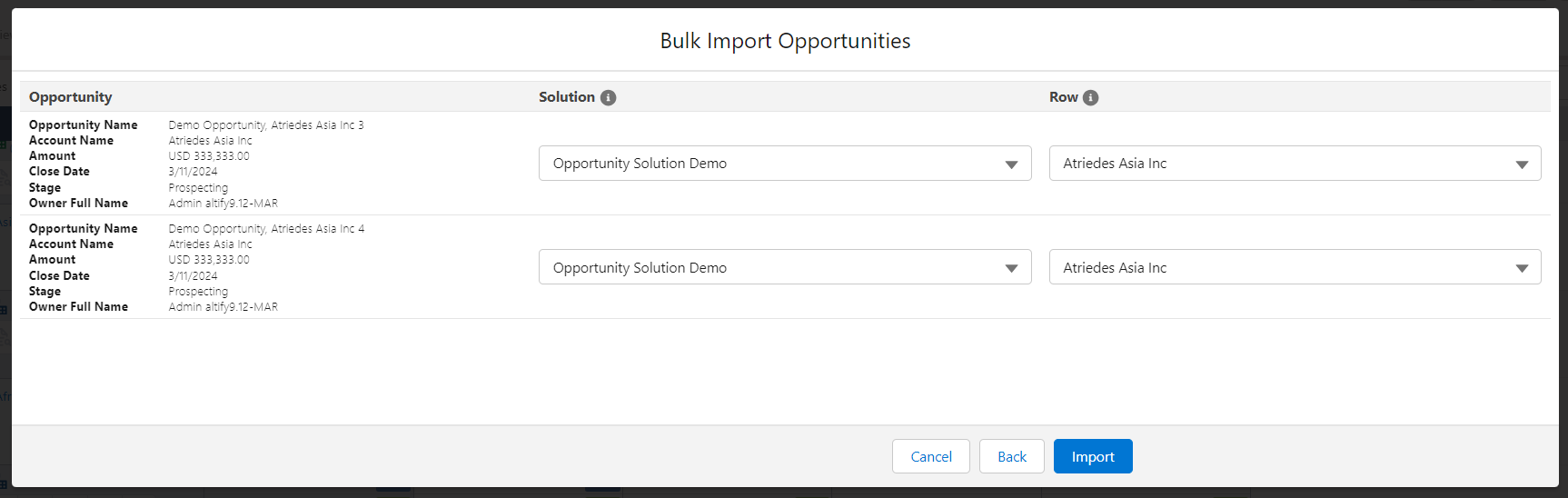 6. On the next dialog, you can confirm the intersection of Solution (column) and account/division (Row) where you would like each of your selected opportunities to appear. The Row field is active in the following scenarios: