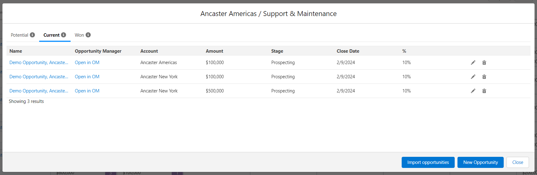 If you are adding opportunities that already exist in your Salesforce org, click Import opportunities to search for the opportunity or opportunities that you want to add.