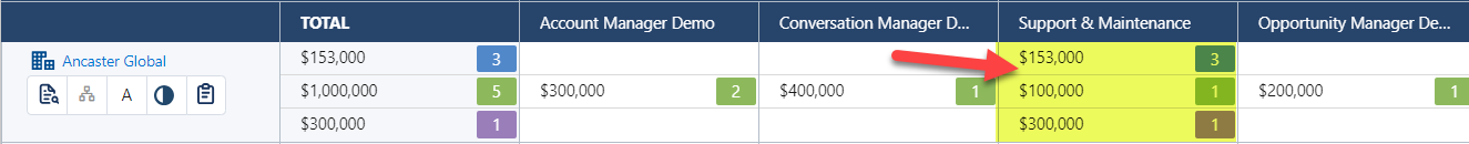 In the example highlighted below, clicking the highlighted intersection will display details of the 'Support & Maintenance' opportunities that exist for the 'Ancaster Global' account.