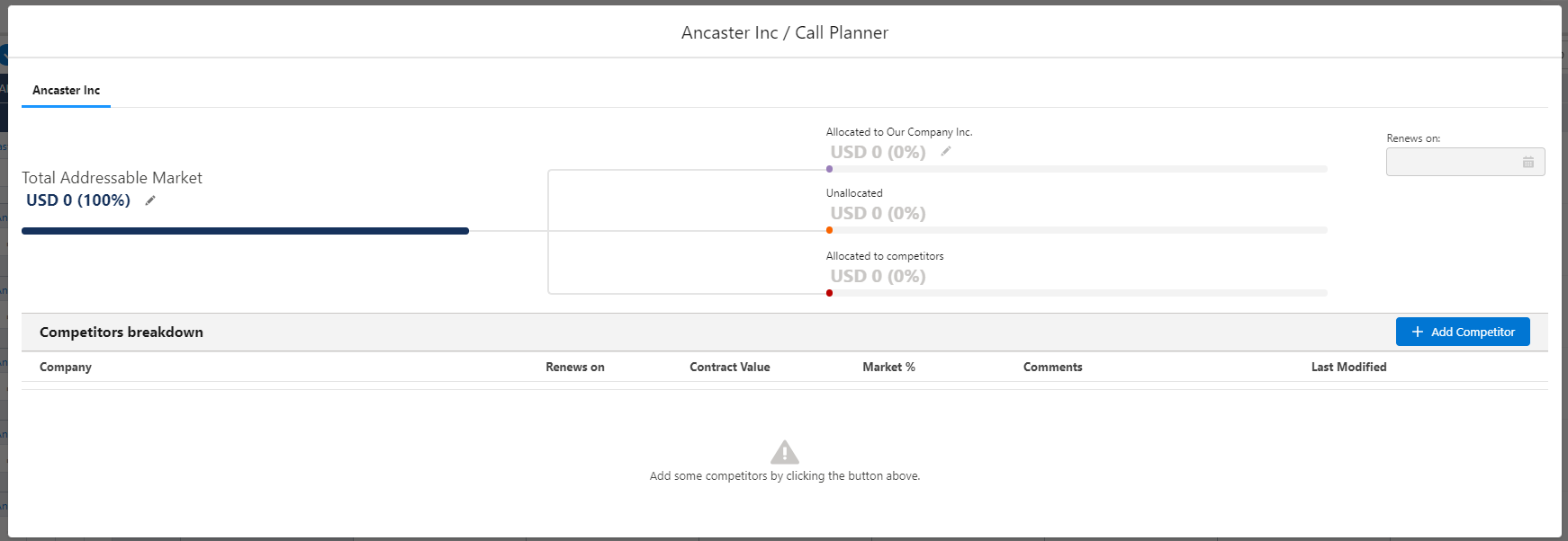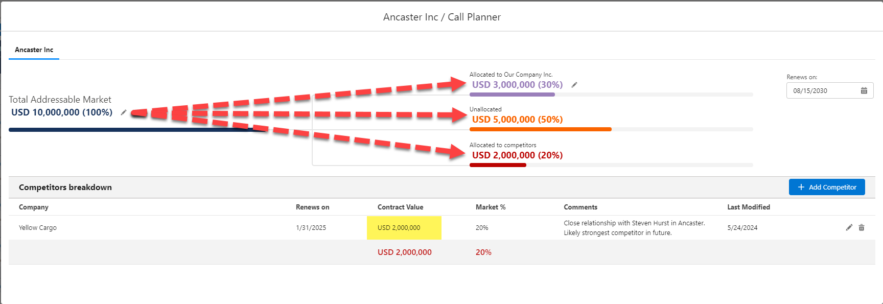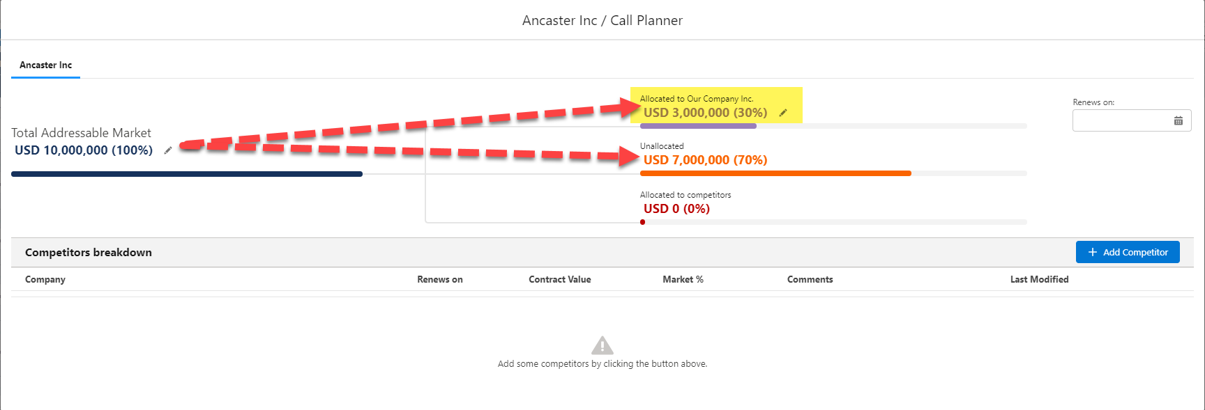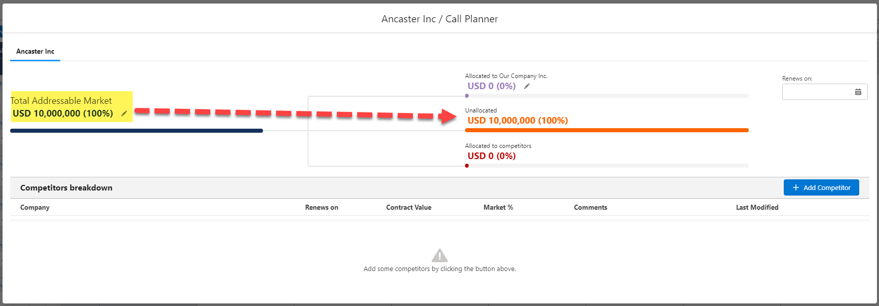 The Allocated to competitors amount is updated to reflect what you entered for Contract Value (highlighted below), and the Unallocated amount is automatically reduced to reflect what remains of the Total Addressable Market.