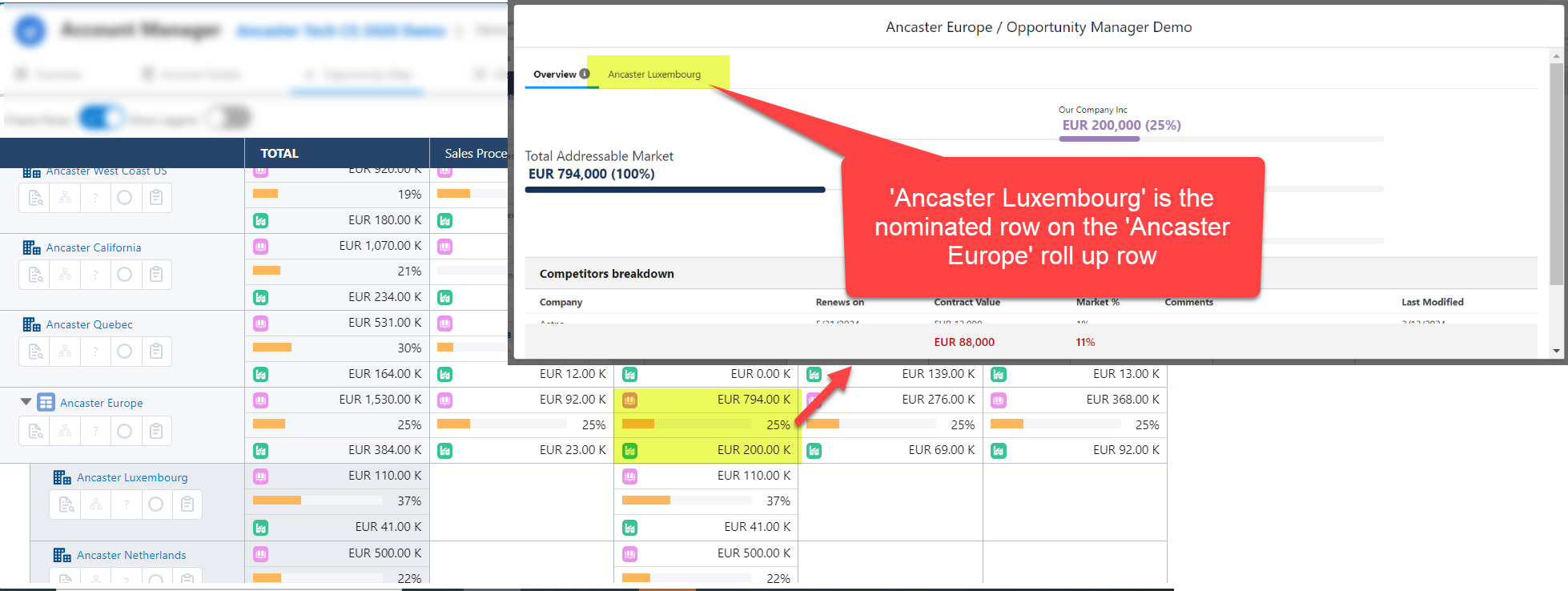 Intersections accessed from the Totals column and roll up rows are read-only. If an account or division is nominated to the roll up row, the specific row information can be accessed via a tab in the roll up row intersection, as seen in the example below.