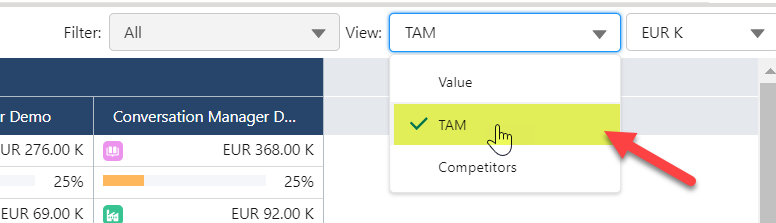 : The total size of the account/division's addressable market for the solution in questionIn the example indicated below (see 1), a TAM of €500,000 exists for the solution 'Opportunity Manager Demo' in the account 'Ancaster California'.
