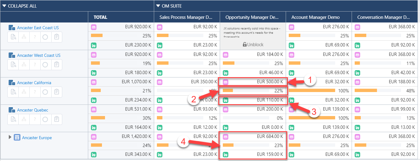 expressed either as a currency value or a number of potentially sellable units.In the example indicated below (see 3), €110,000 of sales have been achieved by the user's org in the Opportunity Manager Demo/Ancaster California TAM.