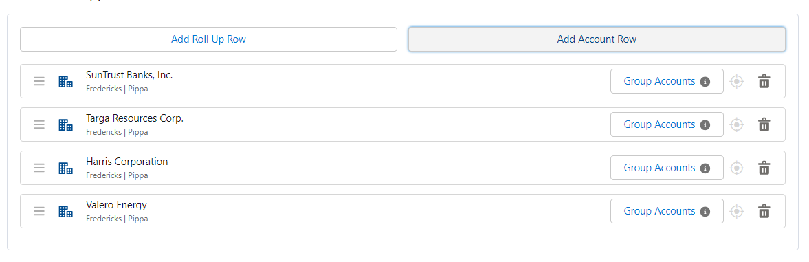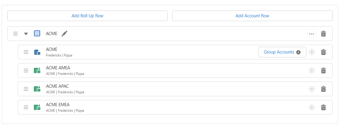 Imagine you want to create an account plan showing your top 5 targets for 2021 and you don’t feel it’s necessary to include roll up rows. You can accomplish this by only using the 'Add Account Row' function.