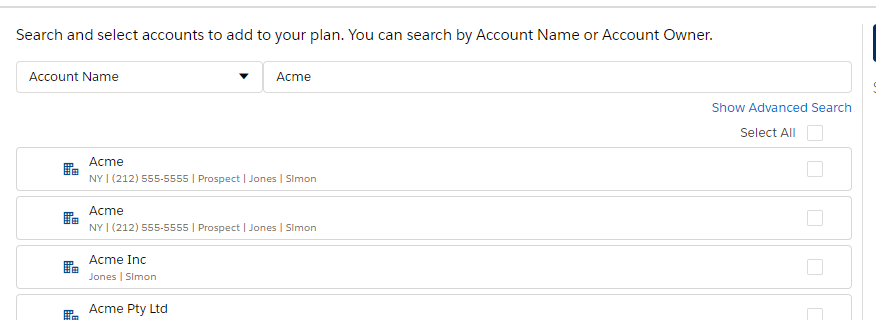 Imagine your organization (ABC Company) recently acquired another company (XYZ Company) and you now have Salesforce account data from both companies in one Salesforce instance. While creating your Account Manager plan, you see multiples of the SAME account (ACME) listed.