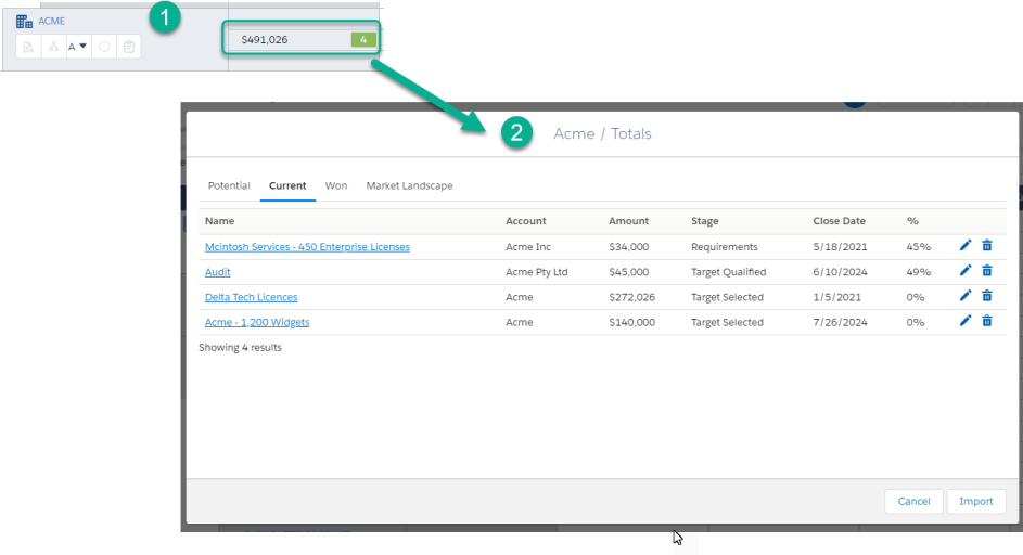 You group the accounts together, so they are represented on ONE row (1) in your opportunity map, and all opportunities for Acme show inline (2).