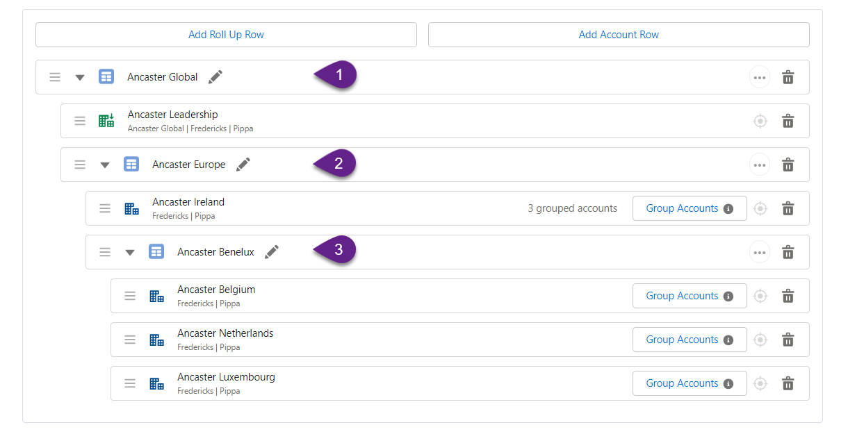 If you want to get more granular with your 'folder' structure, you can add additional roll up rows. (e.g. region, industry, subsidiaries). You can create up to three levels of 'folders' - as indicated in the example below: