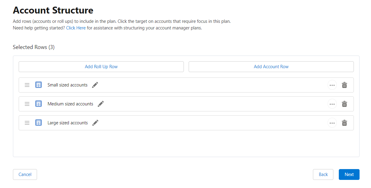 Ask yourself: Are there commonalities between accounts I’m adding to my plan that I want to remember? Am I targeting a few large corporations and their subsidiaries, where I want the structure to show a 'folder' for each corporation? Do I want to view by region or company size?