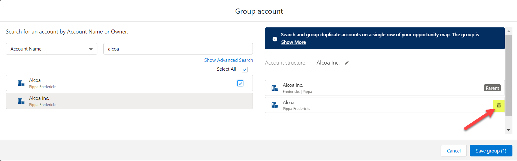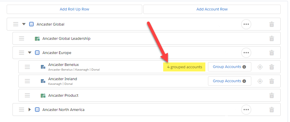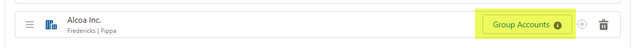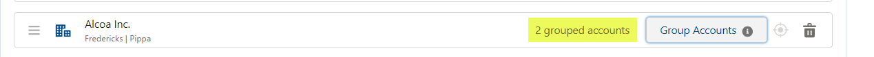 Note in the image below how the trashcan option is available to ungroup the account if required. This option is only available for manually grouped accounts, and not accounts that are grouped due to parent/child relationships in your Salesforce org.