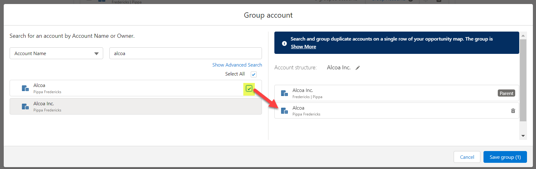 In the example shown below, the 'Alcoa' account is being grouped with 'Alcoa Inc.'