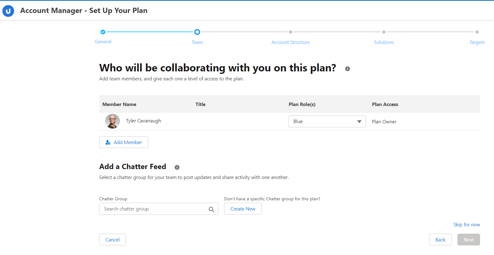 The Team page (shown below in plan creation mode) is where you can add members to your Account Manager plan team (the people who will collaborate with you); adjust each team member's level of access to the plan; set up a Chatter group to keep team members updated about the plan; and remove team members if required.