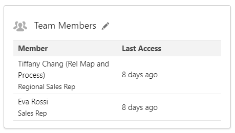 The Team Members panel (shown below) on the Plan Overview page displays the members of the Account Manager plan team, along with each member's title and when they most recently engaged with the plan.