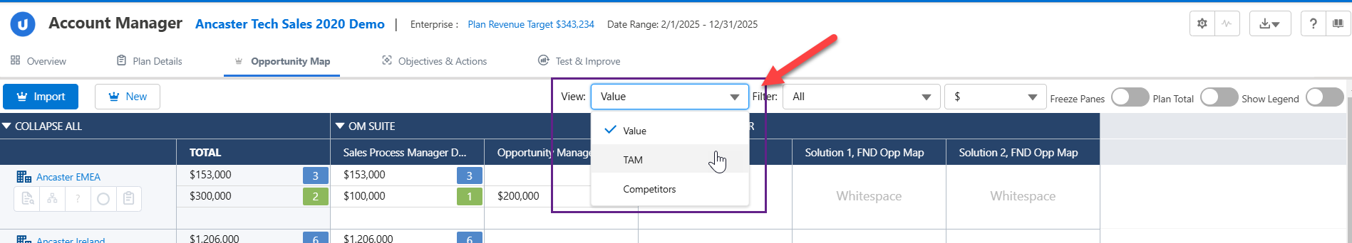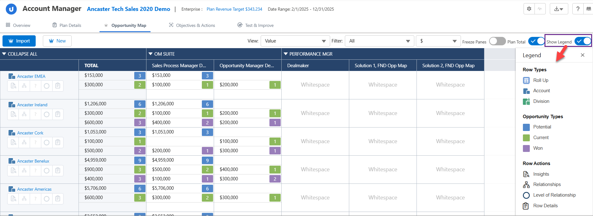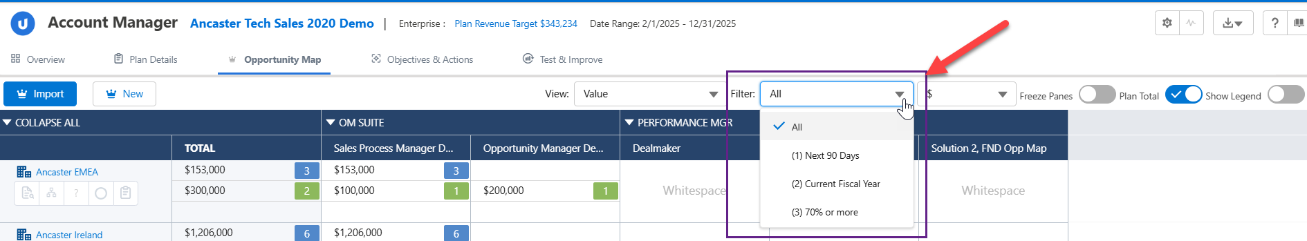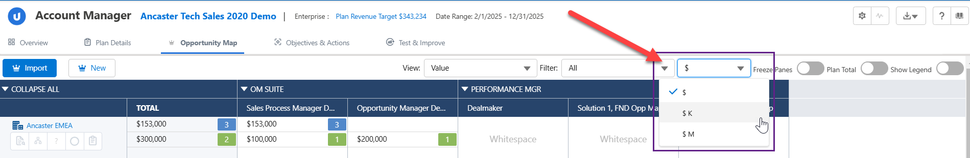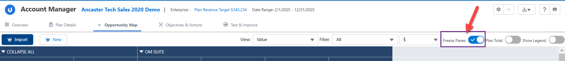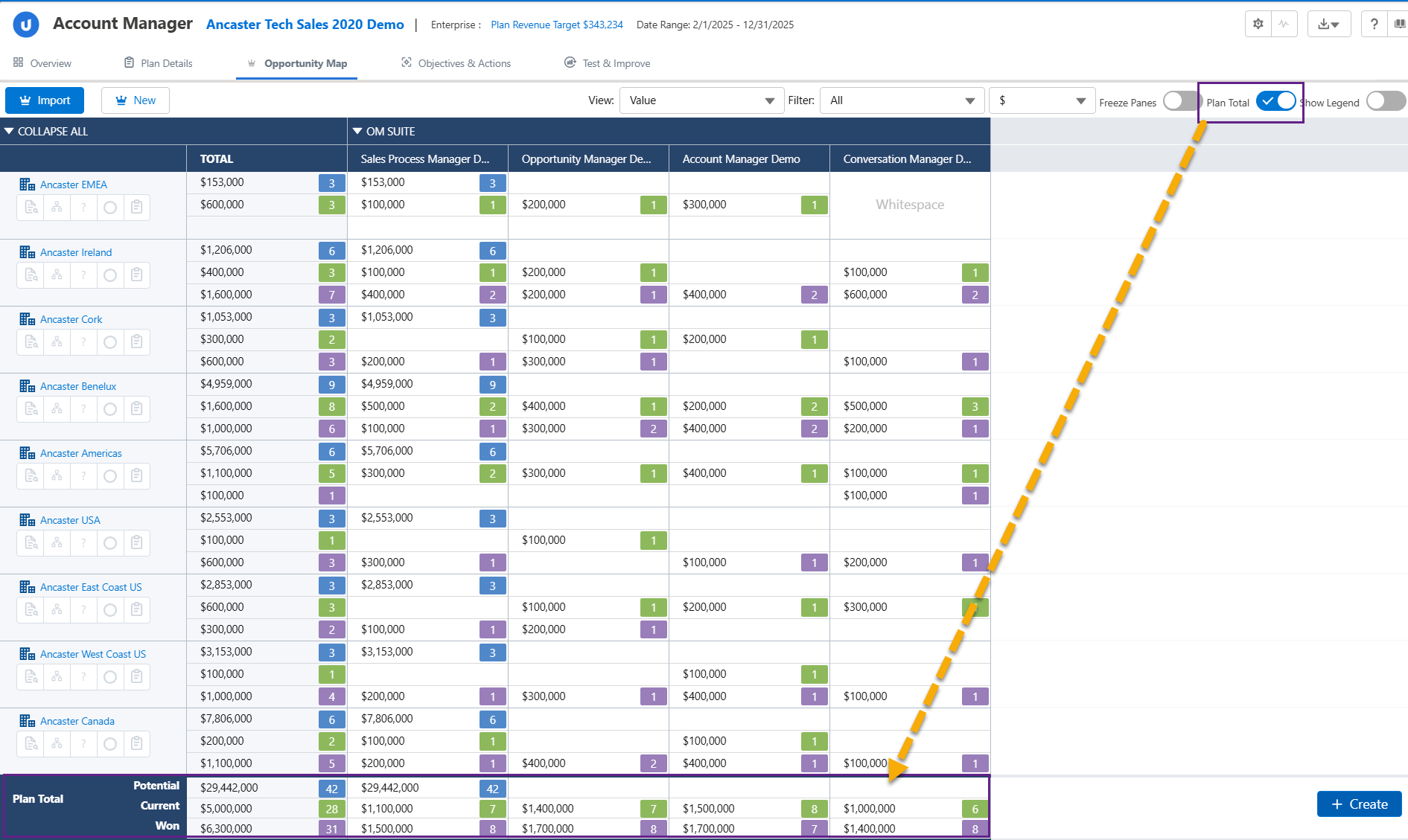 Enable the Plan Total toggle to roll up all the opportunity amounts in a single row at the bottom of the opportunity map.