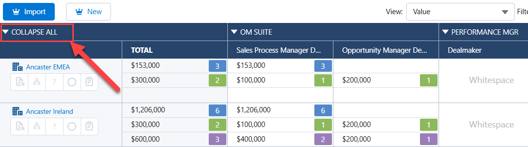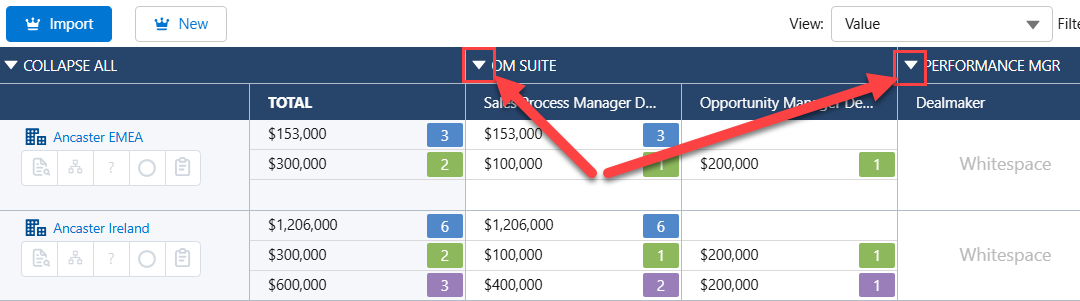 If your organization applies solution family functionality (whereby solution columns in your opportunity maps are grouped according to 'solution families'), you can collapse solution families so that all the relevant opportunity amounts are totaled in a single column for each family.