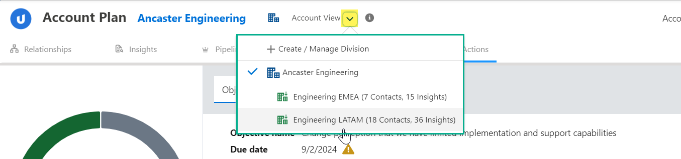 If an account division is selected (as shown in the example below) only objectives and actions associated with a specific division are shown. (All objectives for the account and any account divisions are shown if the parent account is selected).