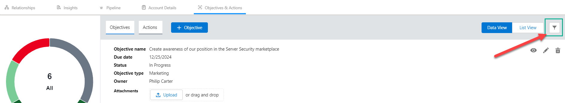 Tip: you can select a segment of the donut chart while a filter is enabled to further filter the objectives/actions by their status.