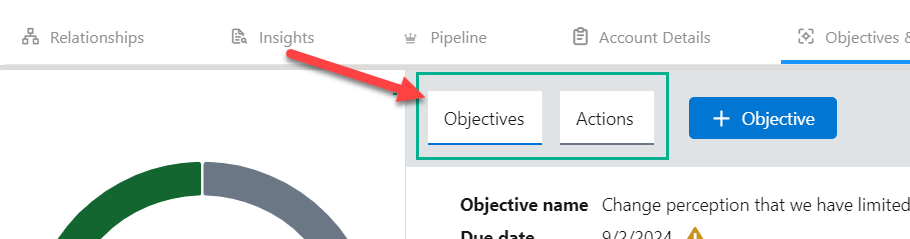 For objectives, click the Actions option (as indicated in the example below) to view any actions that have been created to achieve the accompanying objective.
