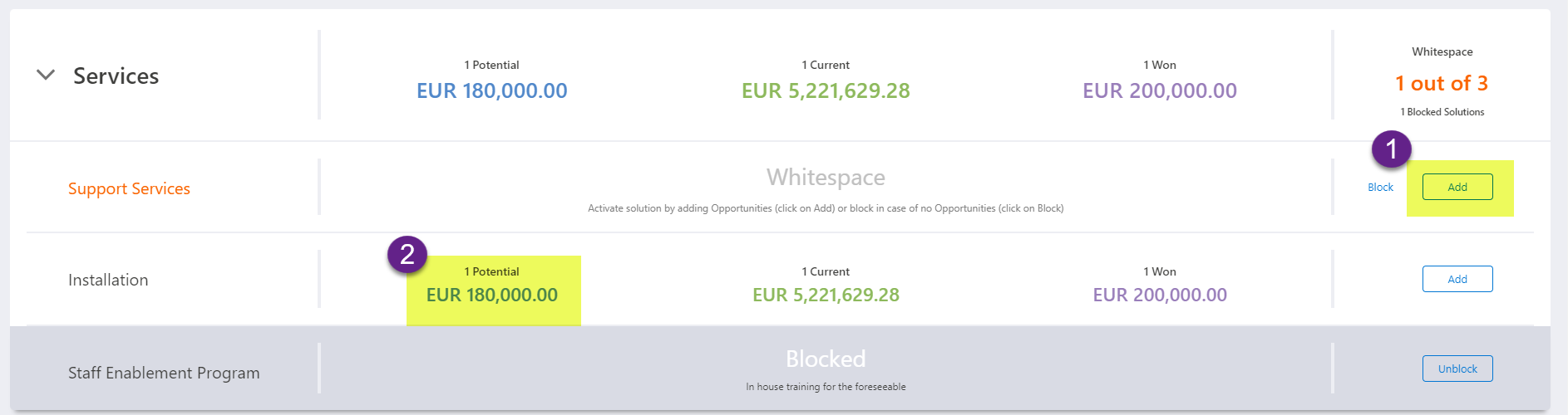 1. Click the Add button on the relevant solution row if you are adding a potential opportunity to a whitespace (see 1 below) and select the Potential tab on the dialog that opens.