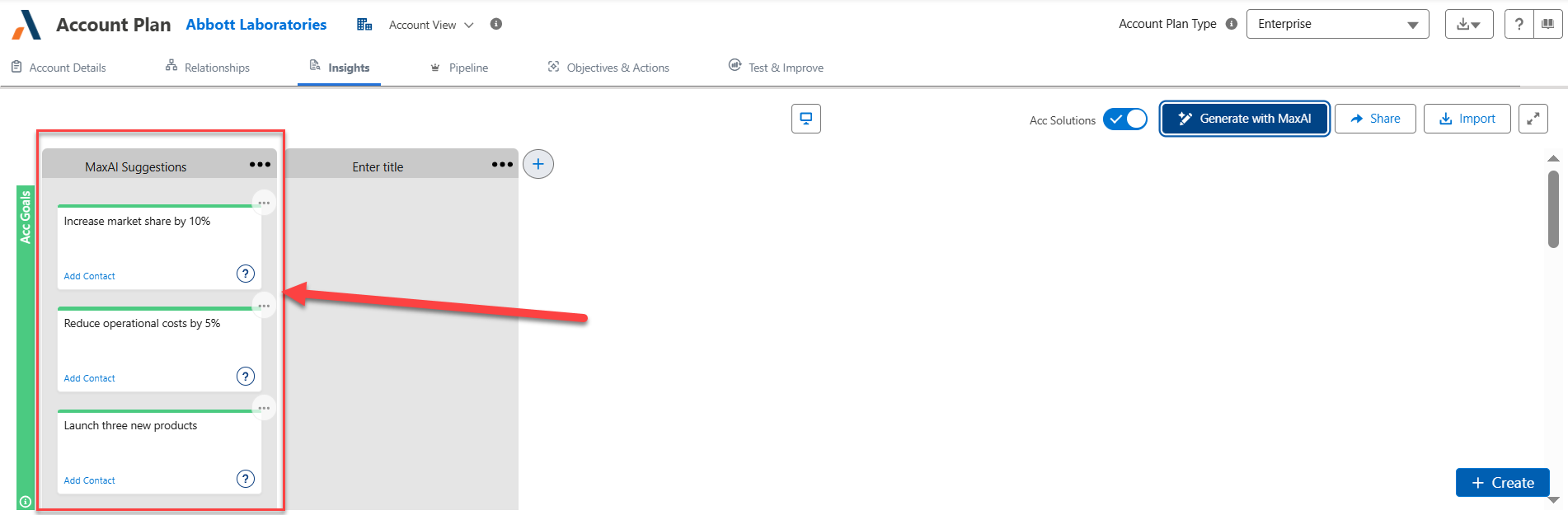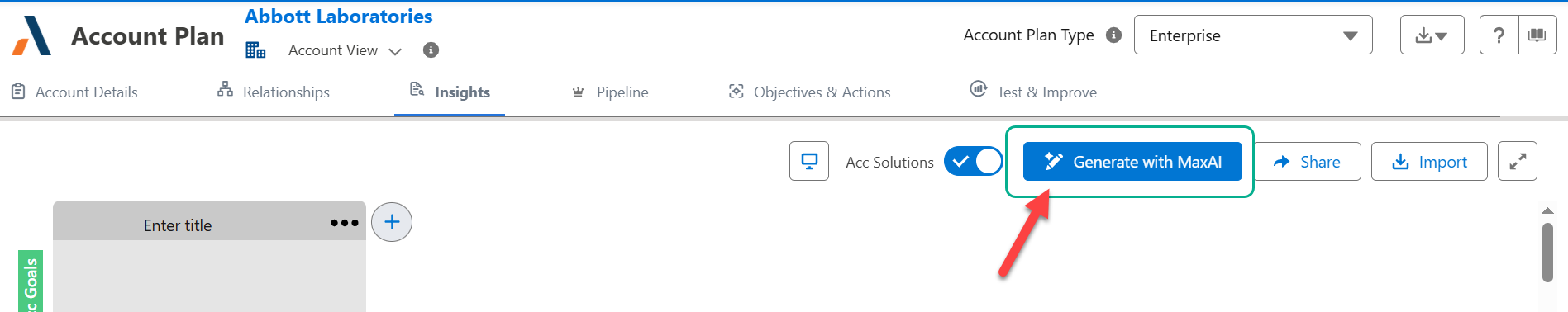 On the relevant account or opportunity insight map, click the button Generate with MaxAI (as indicated in the example below).