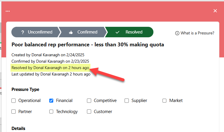 Pressure: 'Unconfirmed' → 'Confirmed' → 'Resolved'