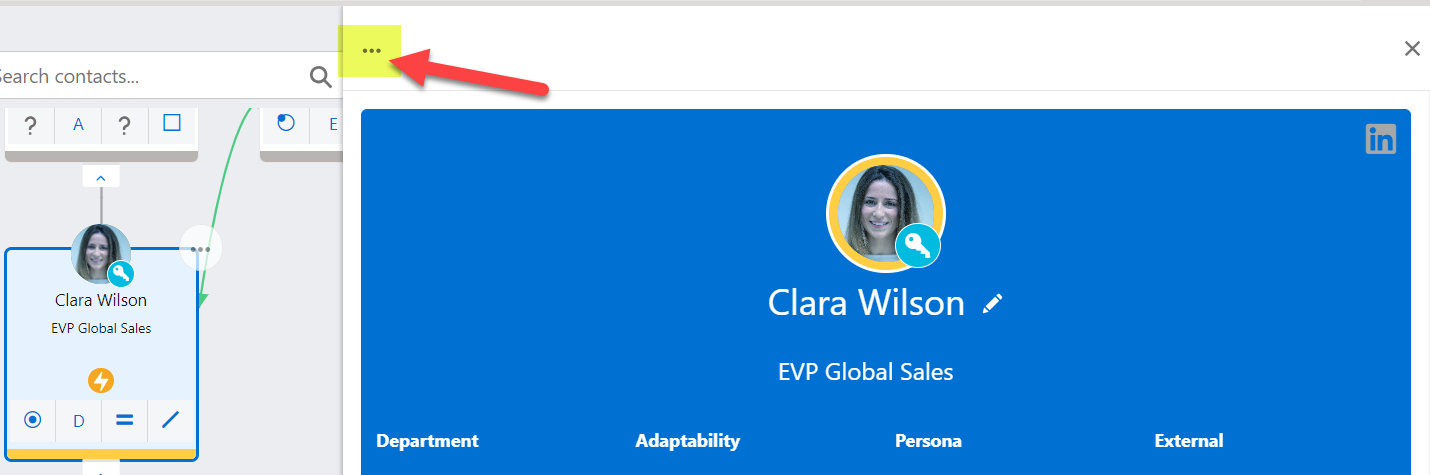 If you need to view or edit contact details that aren't shown on the relationship map, you can open the contact's Salesforce record by clicking the options button (highlighted below) in the information panel heading and selecting the View Salesforce Record option .