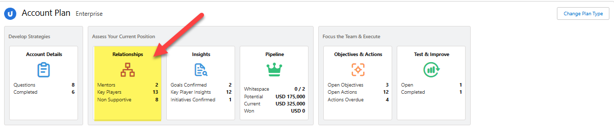 From an account record, click the Relationships tile (highlighted below) on the Account Plan launchpad to access the account relationship map.