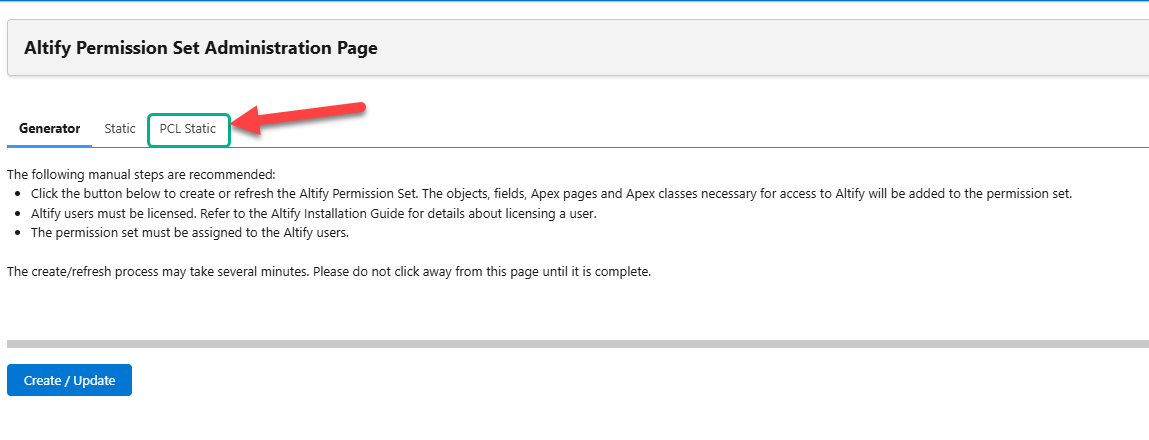 On the Altify Permission Set Administration Page, select the tab PCL Static (indicated below).