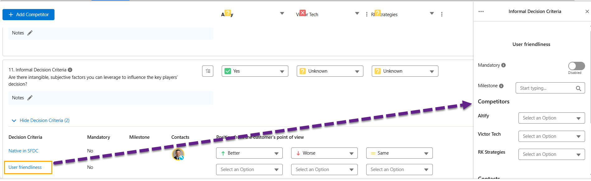 A panel is displayed on the right-hand of the screen (as shown in the example below) where you can add more information about the criterion, such as a contact for whom the criterion is an important consideration.