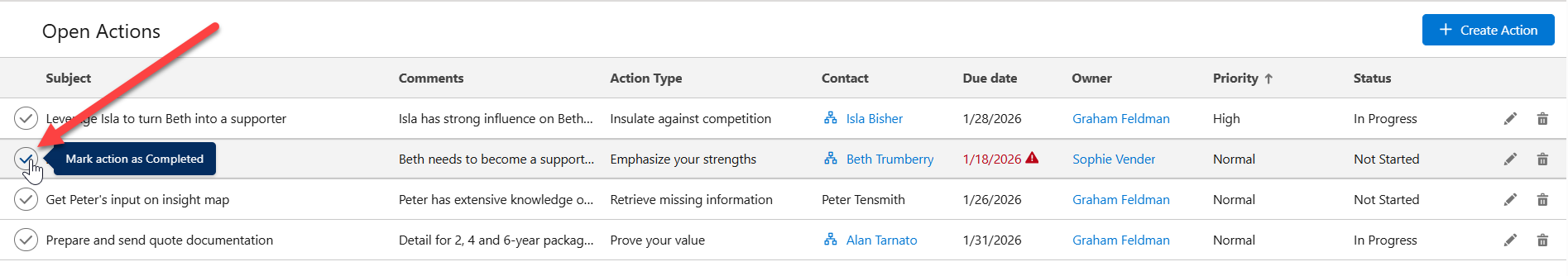 All current actions are shown in the Open Actions list. To mark an action as complete, do the following: