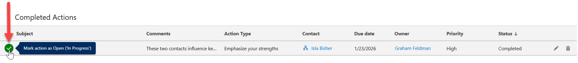 If you need to reopen a completed action, click the green check mark - as shown in the example below. (The Edit Action dialog opens with the action's Status automatically set to In Progress).