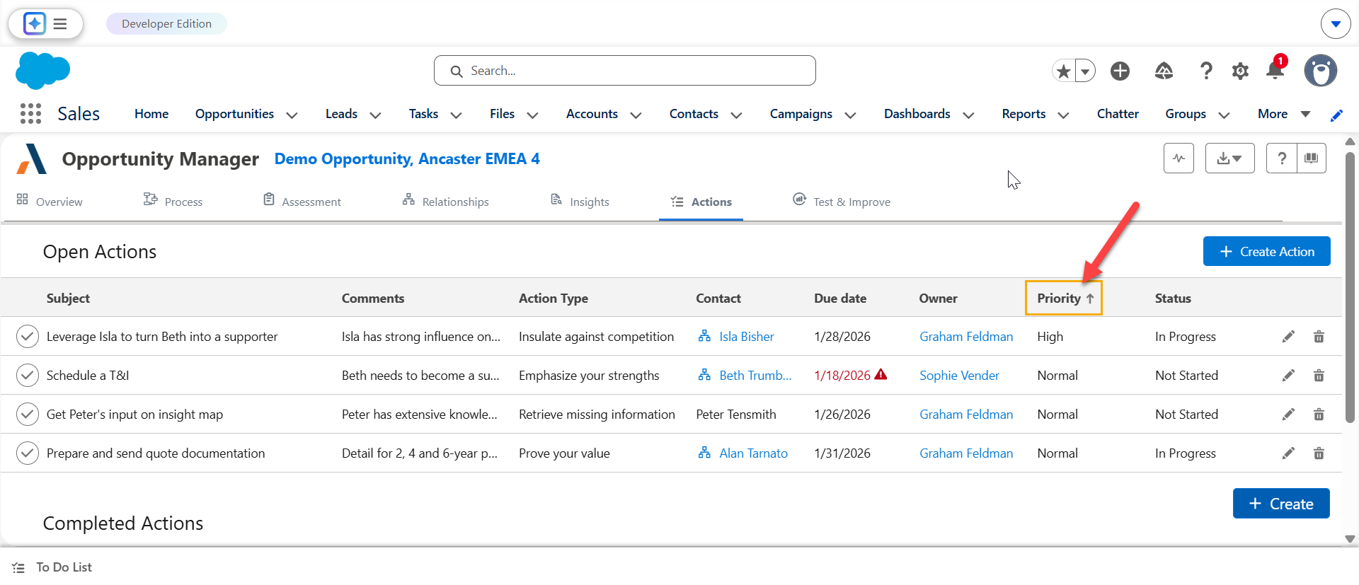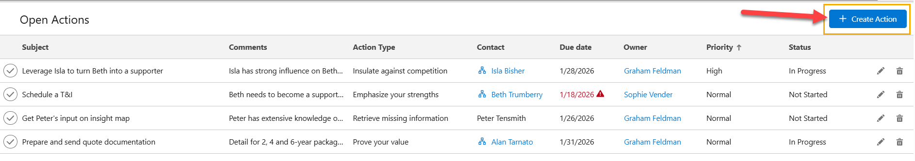 The Actions tab is where you maintain the ongoing list of 'to-do' actions that keeps the revenue team aligned with the opportunity plan.