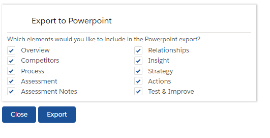 3. The Export to Powerpoint dialog opens. Here you can select which elements of the opportunity you want to include in the PowerPoint file. (The set of options you get depends on the configuration of your org.)