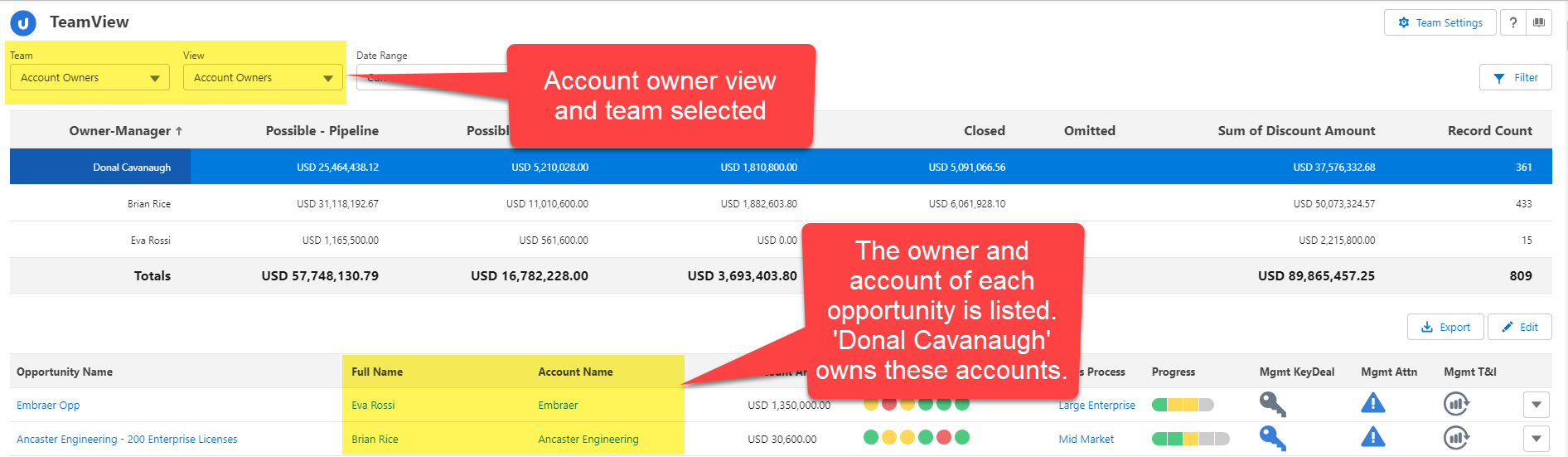 When both the view and the Account Owners team are selected, you get a list of account owners, and the summary totals are for opportunities belonging to the accounts owned by each team member.