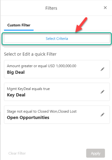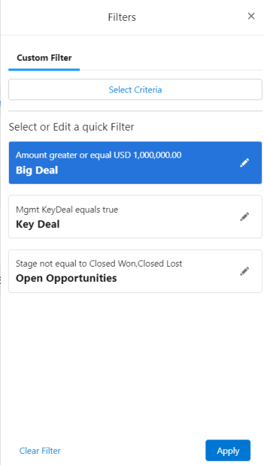 In the example shown below, three quick filters are available for selection: 'Big Deal', 'Key Deal' and 'Open Opportunities' - and 'Big Deal' is currently selected.