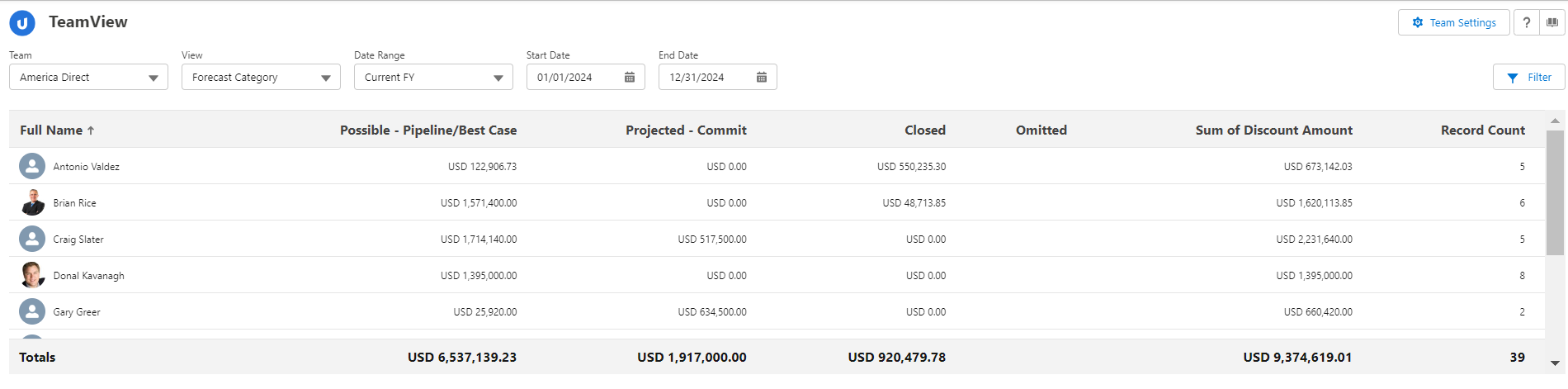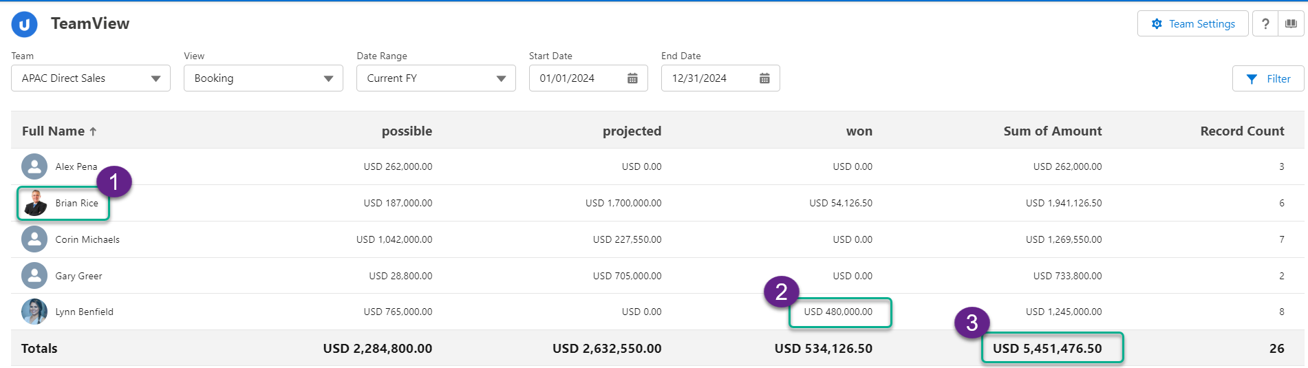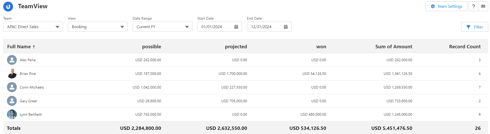 Typically, summary totals are based on the values of the opportunities owned by each team member. For example, in the 'Booking' view (shown above), this is how the totals are calculated.