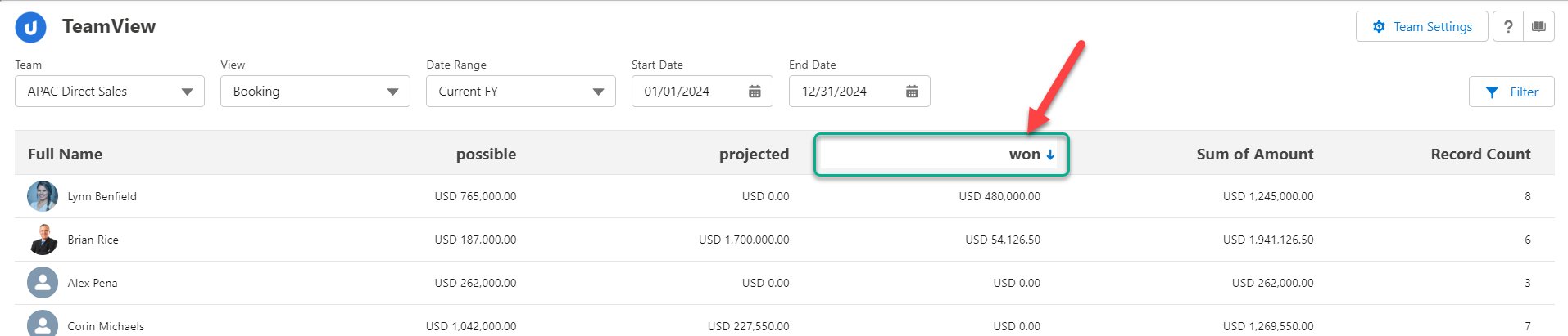 Click to view all possible, projected and won opportunities belonging to any of the listed team members.