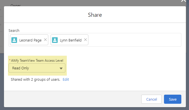 The Altify TeamView Team Access Level field (highlighted below) allows you to determine whether their access is read-only or read/write.