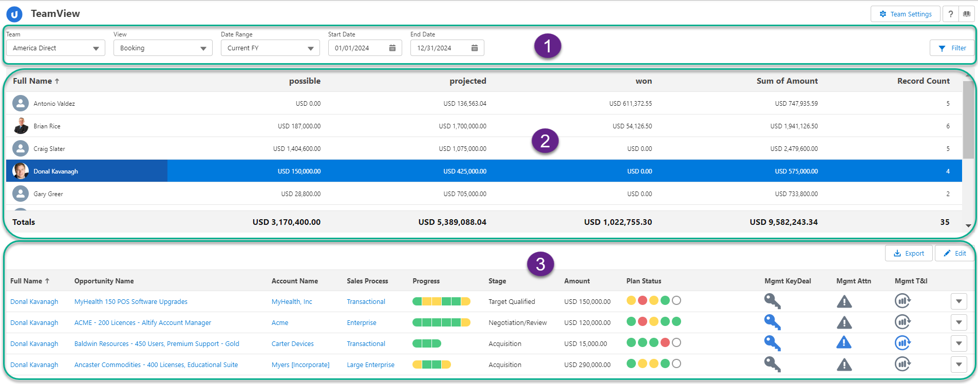 This is where you see summary totals for team members. Click a total or a team member to see the associated individual opportunities.