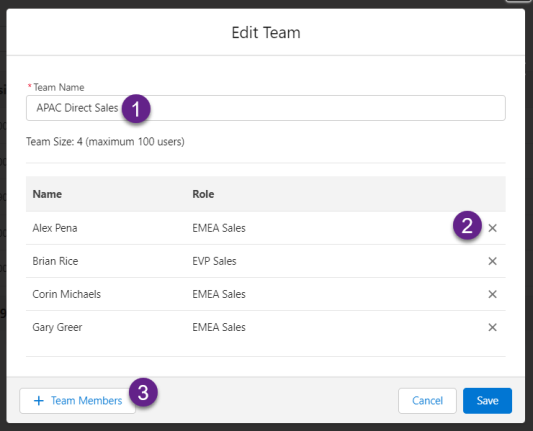 In the Edit Team dialog (shown below), you can do any of the following: