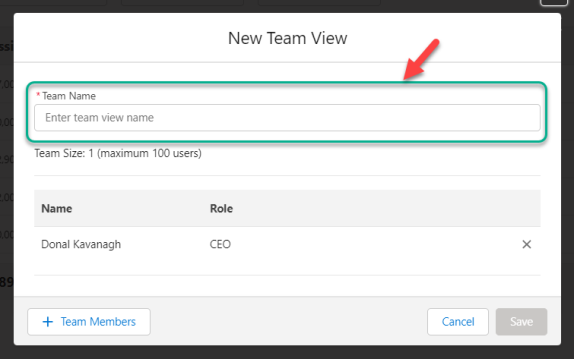 - On the New Team View dialog, enter a Team Name (as indicated below).