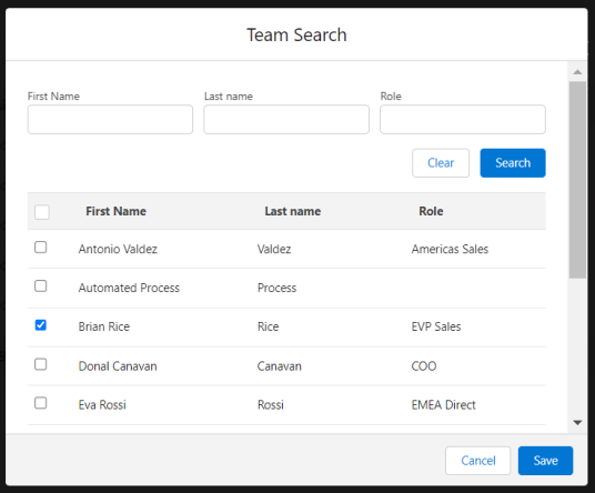In the Team Search dialog, you can search and select the users to add to the team.