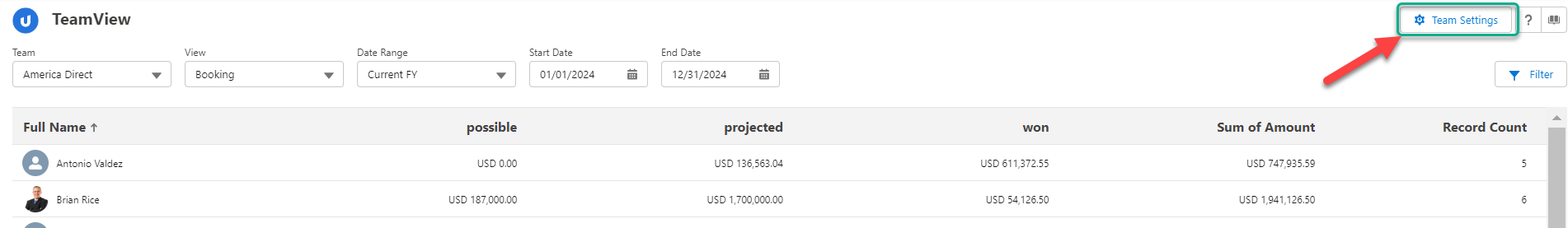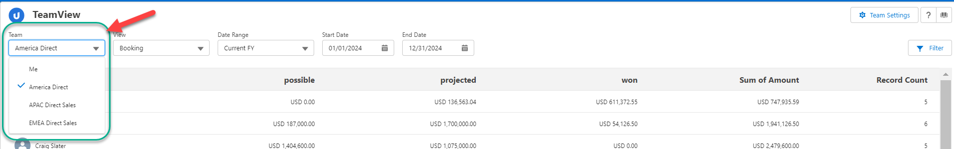 Summary totals are shown for the members of the team that is currently selected.