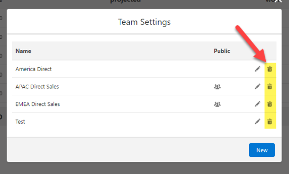 - On the Team Settings dialog, click the relevant Delete icon